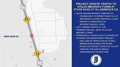 PROJECT UPDATE: Crossover closure planned for intersection on State Road 37 in Lawrence County